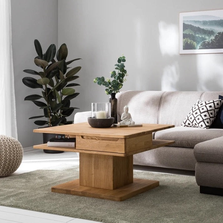 Give your living room an unmistakable character with our Kvadro coffee table. Kvadro coffee table. Original, sturdy and practical. Undoubtedly not just any table, but a piece of real wood in your living room with a design that will help you keep your living room tidy (two drawers) and that will not leave your guests indifferent. Its rounded corners also make it ideal for family homes.