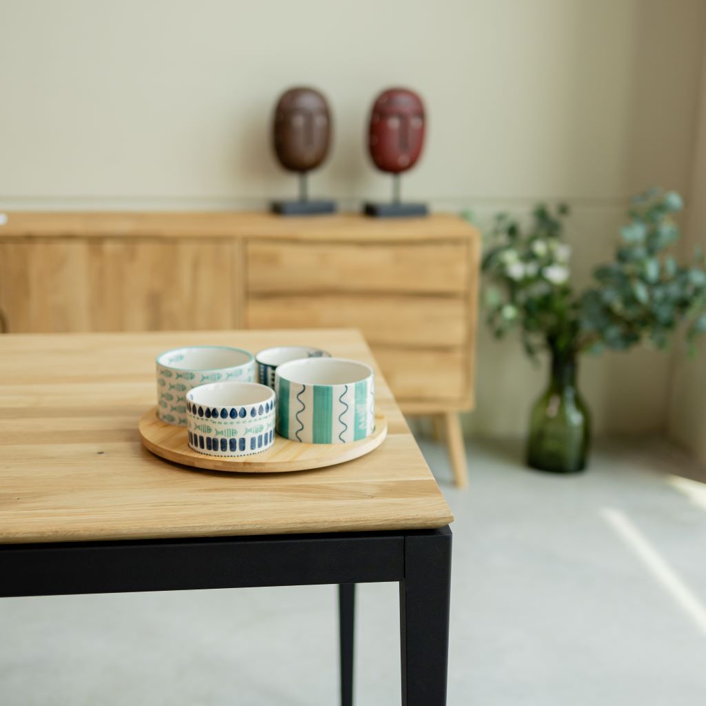 Specifications and maintenance: easy to clean with a soft or slightly damp cloth. Avoid contact with aggressive chemicals. Before using the tables, we recommend covering the worktop with wood wax, so it forms a thin layer of protection against absorption of liquids. All other furniture 1-2 times a year should be treated with tung oil to protect and moisturize the wood.