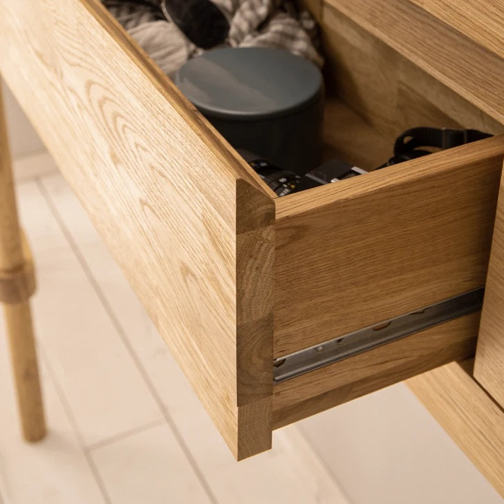 Easy to clean with a soft or slightly damp cloth. Avoid contact with aggressive chemicals. Before using the tables, we recommend covering the worktop with wood wax, so that a thin layer of protection against absorption of liquids is formed. All other furniture 1-2 times a year should be treated with tung oil to protect and moisturize the wood.