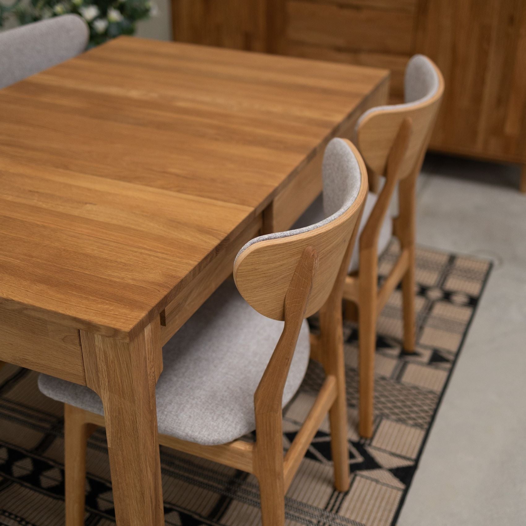 Made of solid natural oak, the chair Maxwell chair chair is distinguished by its soft and welcoming appearance, highlighting the authentic beauty of the wood. The light gray fabric upholstery, elegant and soothing, creates a delicate and elegant contrast with the wood. The chair's rounded lines add a dimension of comfort and conviviality.