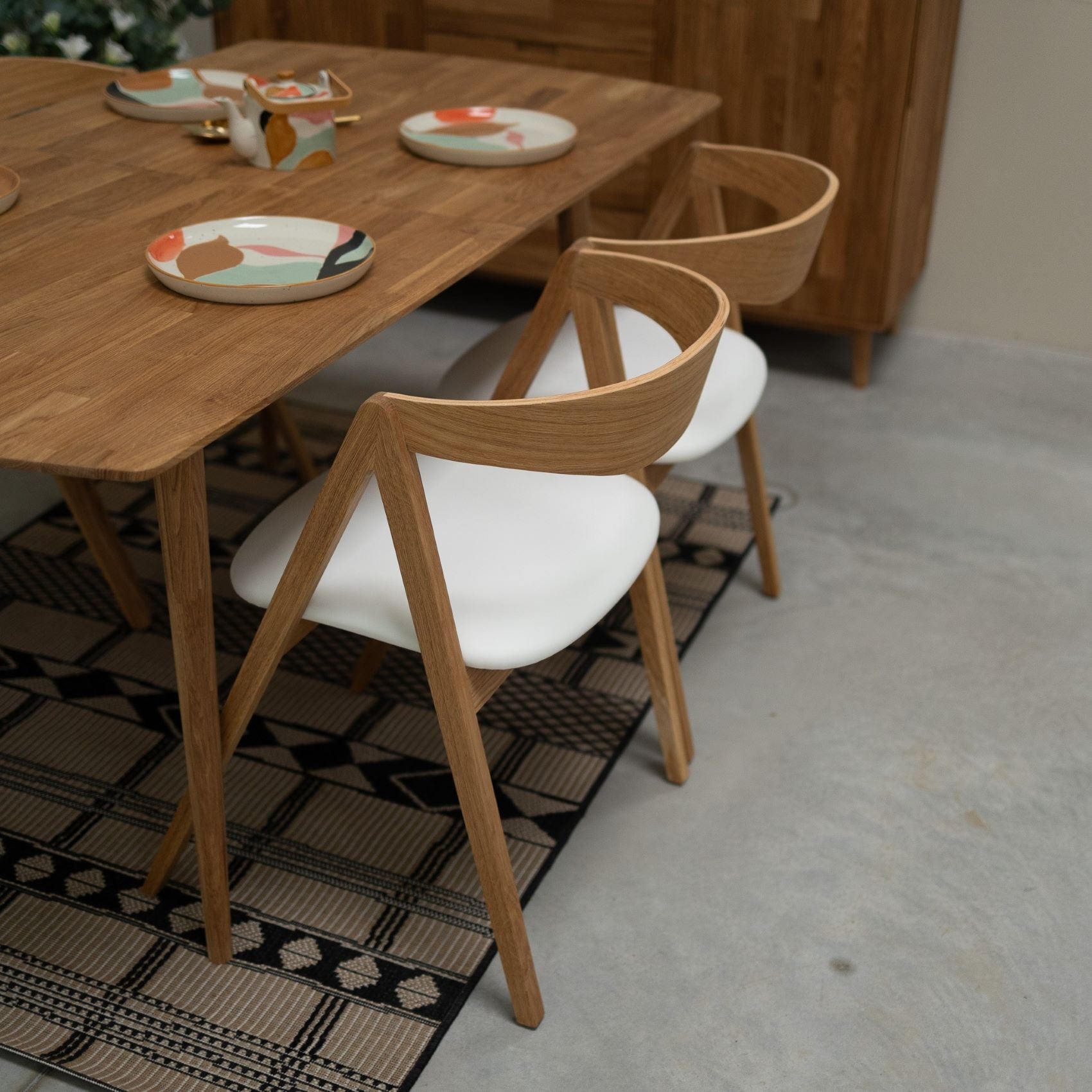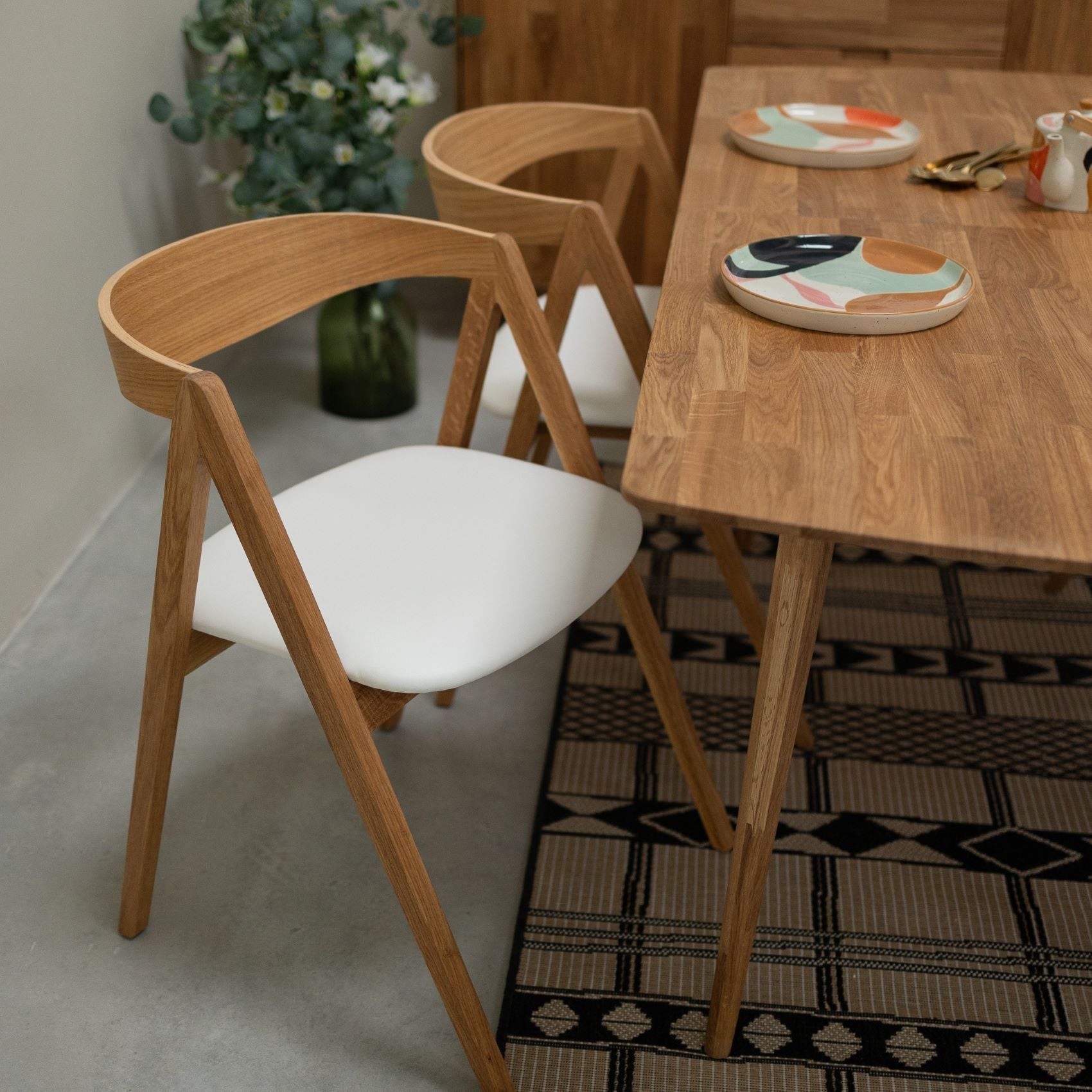 The chair in solid natural oak wood Oscar is distinguished by its Scandinavian style, both sober and refined. The wood enhances the richness of the oak, while the white faux leather adds a touch of modernity and freshness. Its ergonomic seat and enveloping backrest ensure remarkable comfort. The clean lines and slightly tapered legs, typical of Scandinavian design, give this chair a discreet elegance, making it an ideal centerpiece for a dining room.