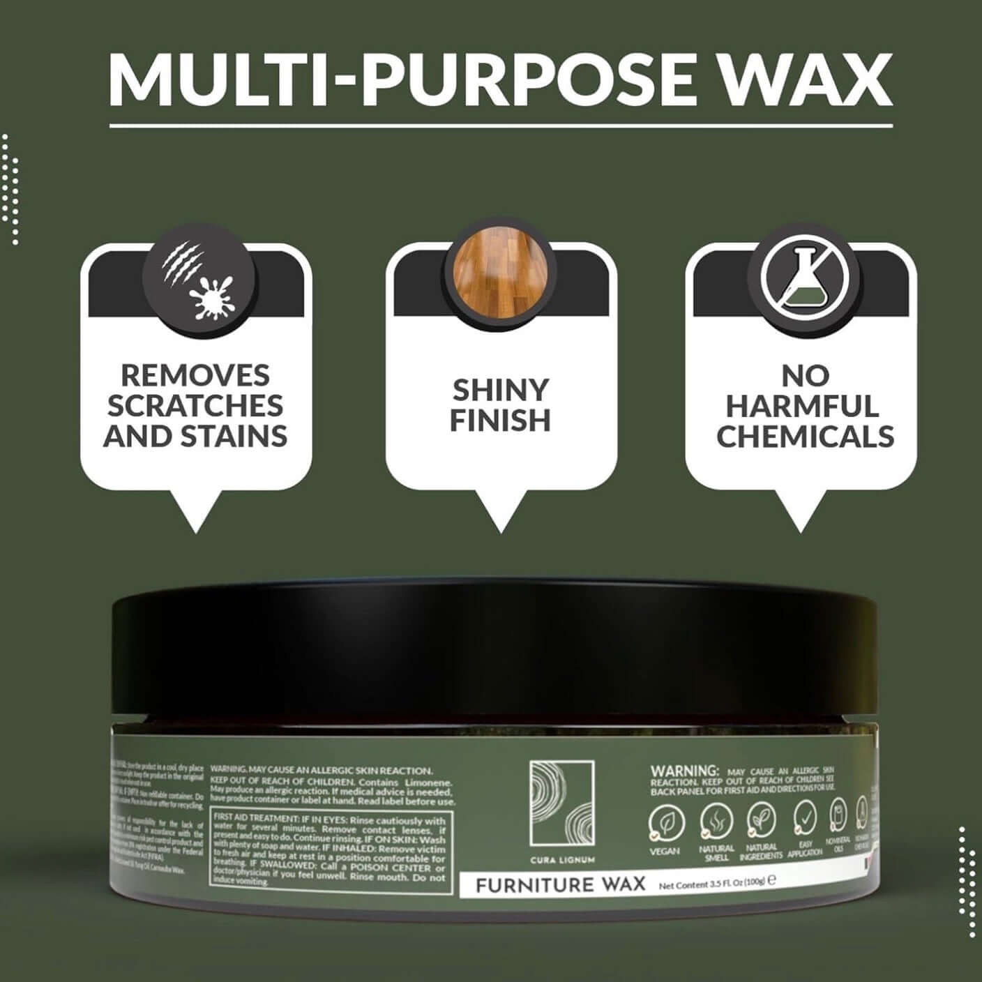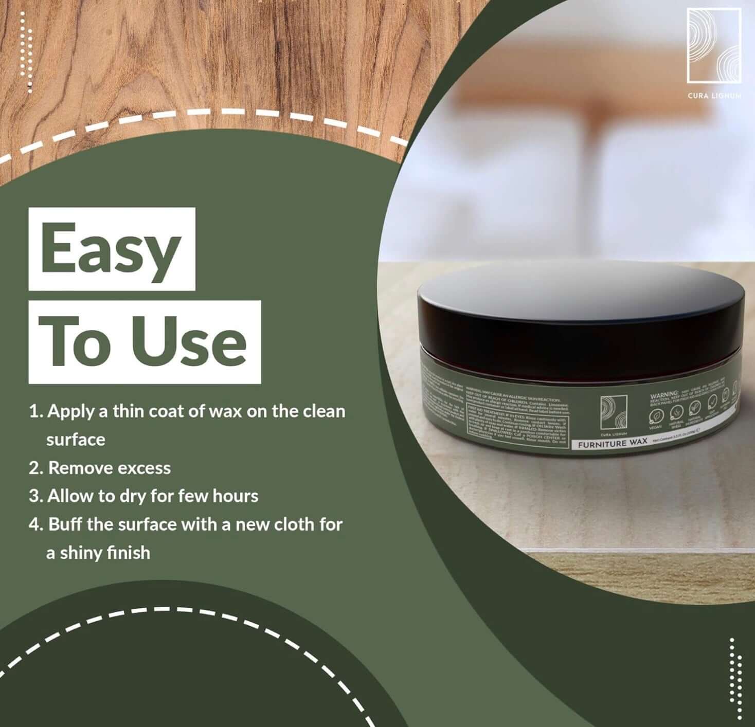 EASY TO USE: Apply a thin layer of our Cura Lignum natural beeswax for wood on the clean surface of the furniture, then remove the excess and let it sit for several hours until dry. Finally, polish the surface with a new cloth to achieve a glossy finish.