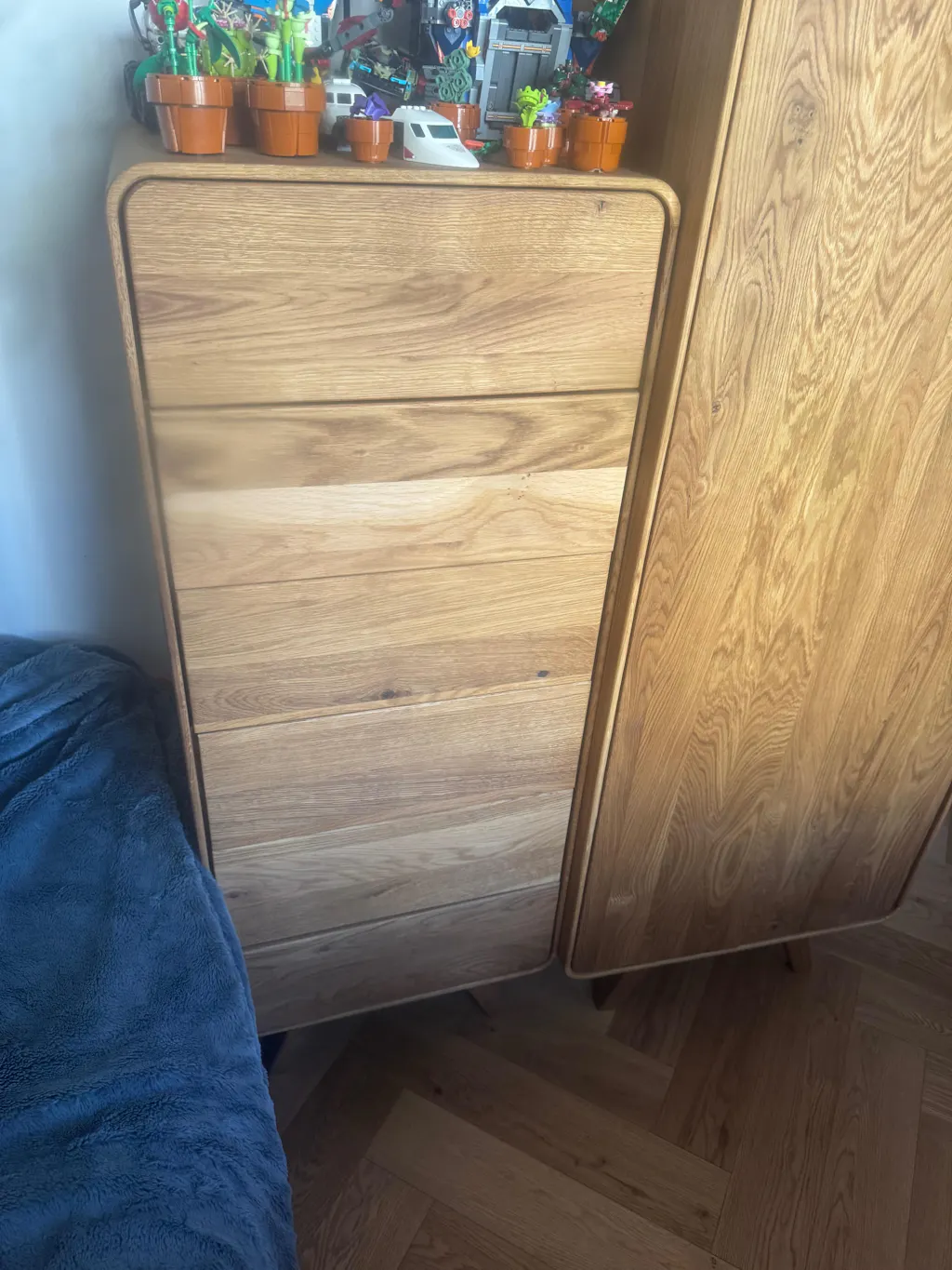 The chest of drawers "Geneva" is made of solid sustainable oak wood, combining a sleek Nordic design with great durability. Equipped with 4 spacious drawers, this piece of furniture offers storage space for clothes and accessories, keeping everything organized. Thanks to its versatile design, it can function as both a bedroom dresser and a tall nightstand, adding a touch of natural, sophisticated style to any space in the home.