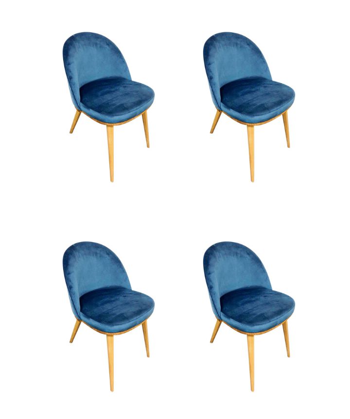 The chair "Clara"is a chair with sinuous and elegant curves upholstered in blue velvet. Its curves adapt well to the body offering comfort to its occupant. It is a sturdy chair as it is made of solid oak wood.