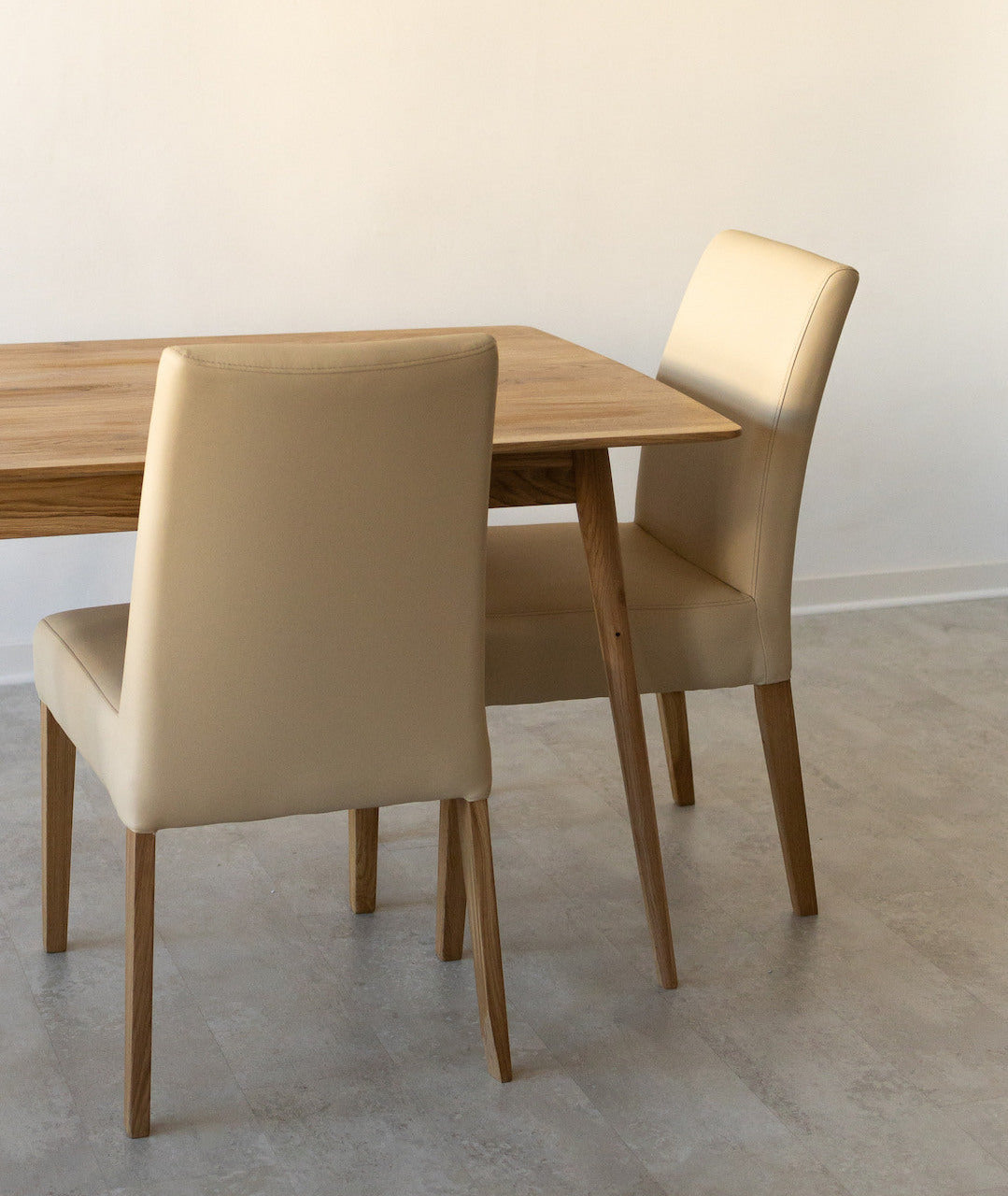 The chair "Malaga"has a timeless design and is upholstered in beige PVC leatherette. It is a sturdy, resistant and elegant chair made of solid oak wood.